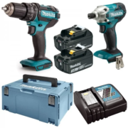 Il set di avvitatori 18v Makita DLX2337J è fornito con trapano avvitatore a percussione DHP482, avvitatore ad impulsi DTD156, 2 batterie BL1830B, caricabatterie DC18RC e valigetta makpac.